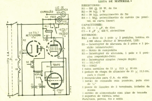 This timer circuit for photography was taken from Popular Electronics in January 1957. The power is supplied by the mains and the relay is of the high voltage type common at the time.
