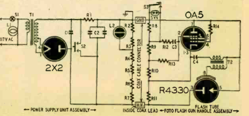 Found in the September 1947 Radio Craft magazine, this 3-tube circuit was mains-powered with a power supply using a transformer. The circuit powered a flash bulb of the time. The high voltage was obtained by rectifying the secondary of the transformer.