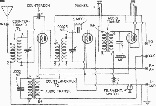 This 1949 3-tube receiver was found in a Radio Electronics at the time. The circuit uses a neutralization adjustment and has a headphone and speaker output.