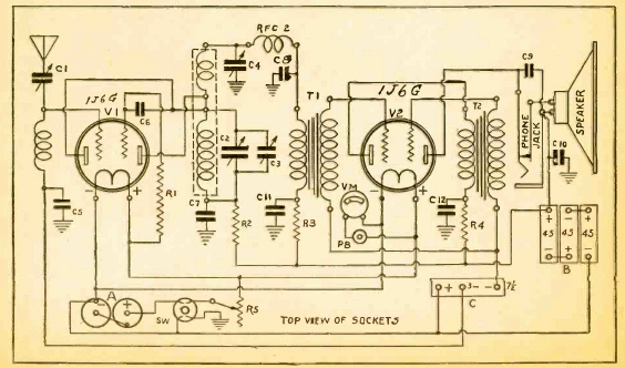 Worth 4 this receiver was found in a Radio Craft from 1942. The circuit is powered by batteries providing speaker output. Note that the first tube is an RF amplifier and the second an amplifier and detector. The pluggable coils determined the tuned frequency band.