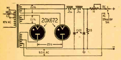 This power source for sound equipment was found in a publication from 1946. It is a sophisticated source for mobile equipment with voltage adjustments and double filtering.
