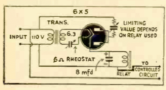 This circuit is based on the tube heating time which can be controlled by a rheostat. The relay is a low current high voltage type which is powered by the valve. The circuit is from a 1944 publication.
