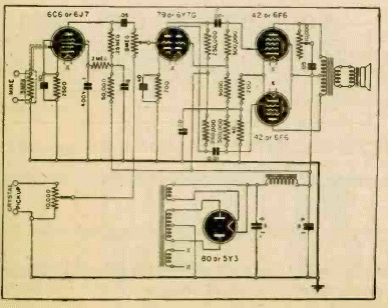 This few watts amplifier was found in a Radio Craft from 1944. The power supply is given. The output is push-pull, and the source uses a full wave tube rectifier.