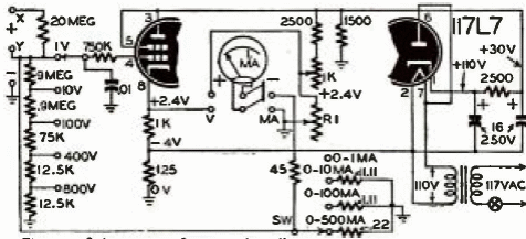 This volt-ohm-milliammeter was found in a documentation from 1936. Note that it is not isolated from the power grid, which requires special care in use and that the tube has a 117 V filament.