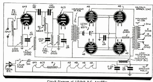 This amplifier with 4 tubes at the output and direct connection to the power grid (power supply without transformer) was found in documentation from 1939. Note the connection of tubes in parallel at the output, a technique used to obtain more power.