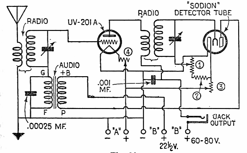 This interesting reflex receiver used a different component, which at the time was showing up. The receiver is from a 1924 documentation and used a sodion tube.