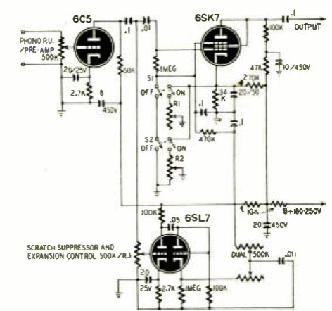 This circuit for eliminating scratching or scraping noise from record players was found in Radio Craft in January 1949. It is sandwiched between the phono captor and the amplifier input. The supply voltage can be taken from the power amplifier itself.