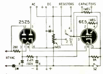 This peephole test circuit was found in Radio Craft September 1948. The circuit is powered directly from the mains with a transformerless source.