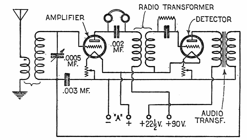 This circuit is from a 1924 book by Gernsback. The receiver uses two tubes and listens to headphones. Power is supplied by battery with the indicated voltages.