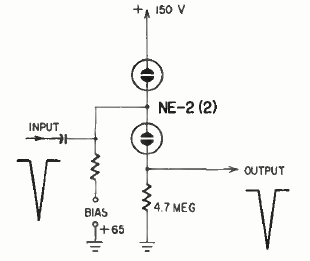 This pulse amplifier circuit is actually a trigger with two neon lamps that are at the threshold of the condition. The circuit is from a Radio Electronics from November 1959.