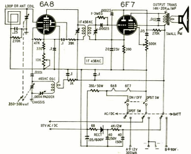 This circuit is from Radio Craft magazine, January 1947. It uses two twin tubes and is mains powered. The band is medium wave and the loop antenna. Listening is on loudspeaker.