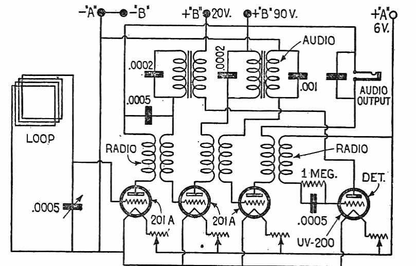 Found in documentation from 1924, this receiver has several sets of coils. Power is supplied by several batteries and listening on high-impedance headphones.