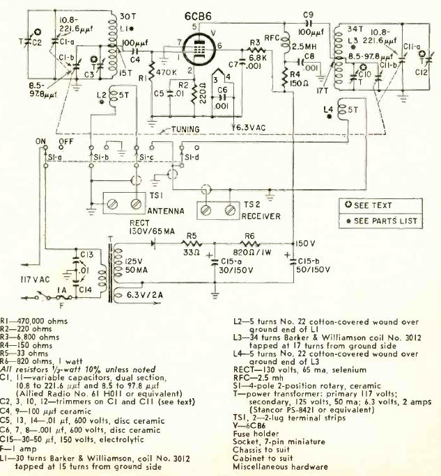 This shortwave preselector for the 3.5 to 40 MHz bands was found in Radio Electronics magazine from February 1960. The circuit uses only one tube and is powered by the power grid.