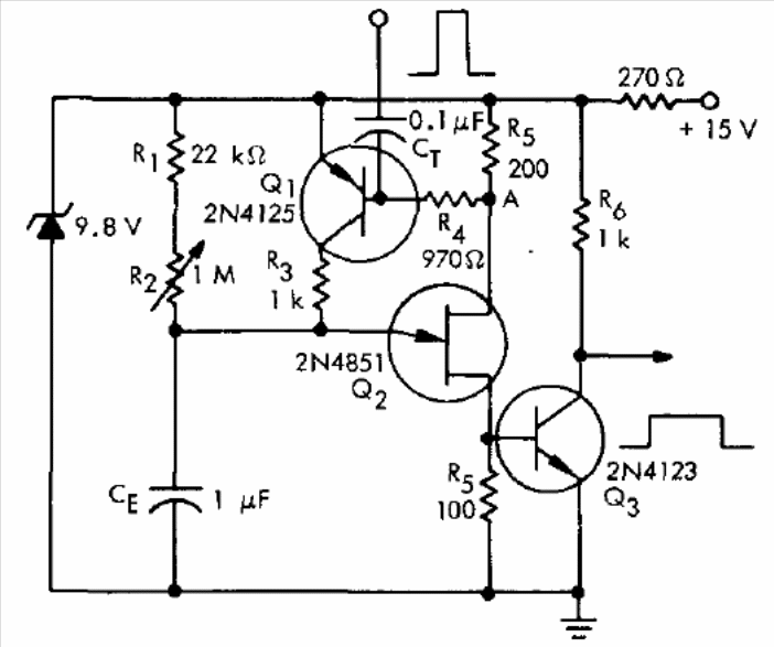 This circuit is from a 1974 publication by Motorola. The unijunction may be 2N2646 and bipolar BC558 and BC548. The pulse duration depends on the capacitor.