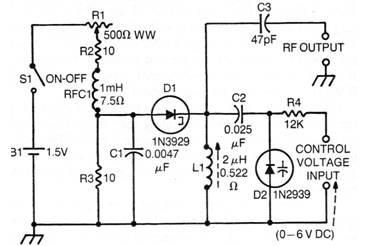 The circuit shown in the figure is from a 1976 publication. Equivalent tunnel diodes can be used. The circuit oscillates between 7 and 12.5 MHz when the control voltage varies between 0 and 6 V. Other varicap diodes can be used instead of D2. Power is supplied with a battery and R1 can be a 470 ohms wire pot. Other frequencies can be generated by changing L1.