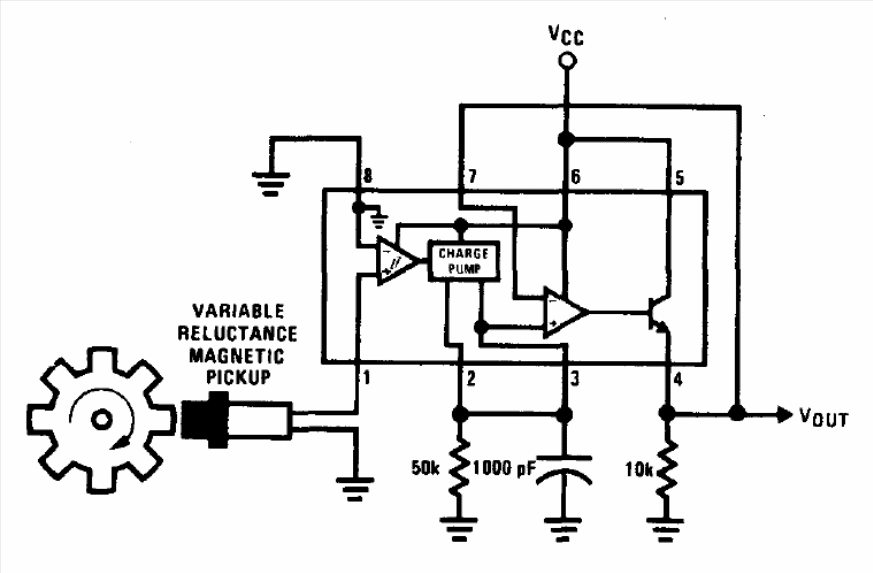The integrated circuit used in this application is the National Semiconductor's LM2907, the configuration wave was obtained. The documentation is from 1978 and the sensor is of variable reluctance. The circuit output consists of rectangular pulses that can be used for TTL applications.