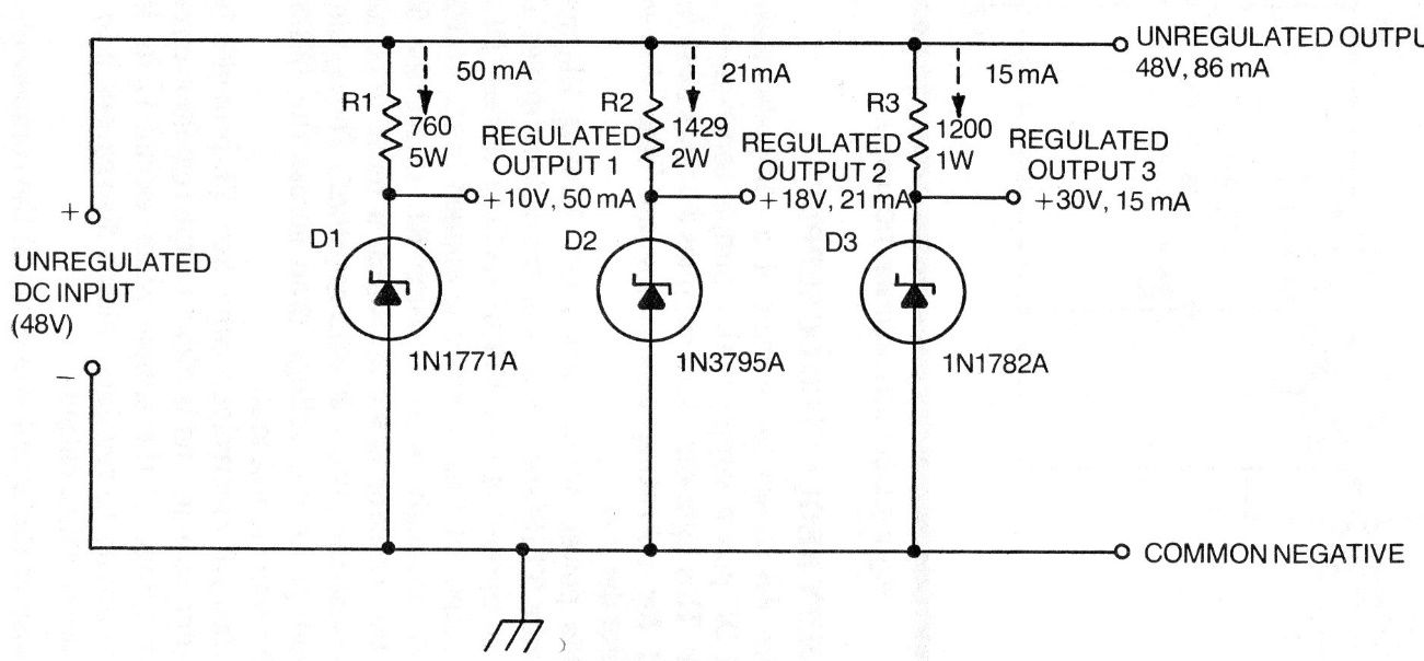 This is a traditional configuration of a series regulator with zeners, found in a documentation from the 70's. The circuit has 10, 18 and 30 V outputs, but the diodes can be changed to obtain other voltages and other currents, depending on the resistors. The input is 48 V, but the circuit can be recalculated to operate with other voltages. The zener diodes are 10 V, 18 V and 30 V in this case.