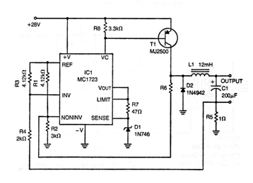 This circuit is from a documentation from the 70s, but it can be assembled with a TIP32 transistor in an original place. The circuit operates at a frequency of approximately 20 kHz producing pulses of current of constant intensity. The critical component of the project is the 12 mH switching shock. The input voltage of the circuit is 28 V and the 1N746 diode is a 3 V zener.