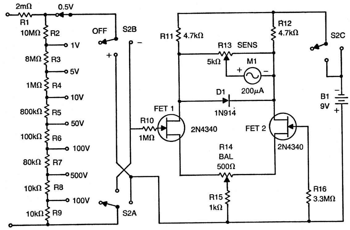 This analog voltmeter with great sensitivity and input resistance has a traditional configuration found in many publications. The circuit is from a documentation from the 70s, but it can be easily assembled with BF245 or MPF102 transistors. The circuit is powered by a 9 V battery with very low consumption. The accuracy of the circuit depends exclusively on the accuracy of the resistors used at the input of the circuit. R1 is 2.2 M ohms and not 2 mOhms as stated in the original.