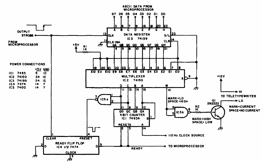 This circuit converts parallel signals for serial transmission and a speed that depends on the timing used. The circuit is powered by two voltages: 5 and 12 V. We obtained this circuit in a 1977 computer publication.