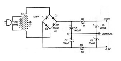 This simple symmetrical power supply is regulated by 1 W zener diodes. The circuit can be powered by the 110 V or 220 V network depending on the transformer and with the change of the secondary of this component and the zeners, other voltages can be obtained. The circuit has no short circuit protection.