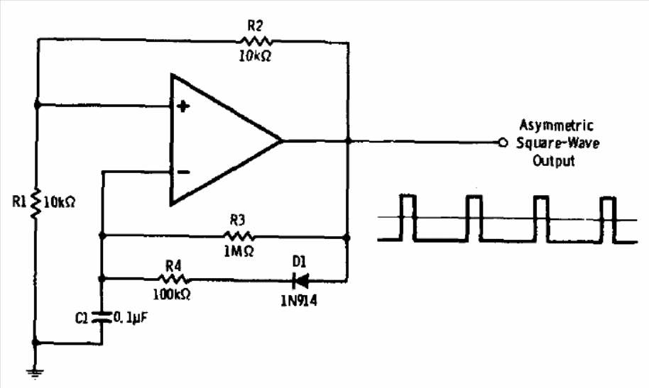 This circuit is from a 1978 operational amplifier manual. The power supply must be symmetrical, and the frequency given by the capacitor. Other operations can be used, and the active cycle is determined by the relationship between R3 and R4.