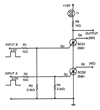 When two pulses reach the inputs of the circuit simultaneously, the PUTs fire triggering the lamp and keeping it lit. PUTs can be more modern equivalents or even SCRs and the lamp can be replaced with an LED. The circuit has an output for signal indication. The minimum intensity of the input pulses is 2 V. The circuit is from an old publication from the 70s.