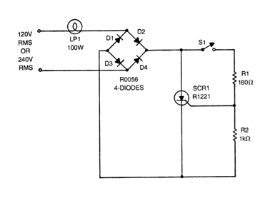 This circuit is only used for resistive loads such as incandescent lamps. The bridge diodes can be 1N4004 or 1N4007 for loads up to 100 W. The SCR can be any of the TIC series depending on the load and the supply voltage. The circuit is not isolated from the grid and the current in the switch is very low.
