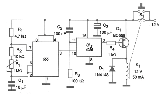 One of the problems with the 555 integrated circuit, normally used when timing is desired, is that in addition to 1 hour, the need for high value capacitors and resistors makes the circuit unstable. In fact, the maximum time of this order is due to the limitation of the capacitor to approximately 2 200 uF and the resistor to around 1.5 M ohms. One way to obtain long timings, exceeding 15 hours, as in the case of the circuit shown in the figure, is with the use of a 14-stage CMOS binary counter, such as the 4020 integrated circuit. Thus, the pulses generated by the 555 are counted up to 16 384 before the relay is activated, thus ending the timing. It is easy to see if the 555 generates 1 pulse every 10 seconds, we will get a 160 840 second timer! In the presented circuit, the timing starts when the S1 button is pressed, in which case the relay closes the contacts and the 555 starts to oscillate. At the end of the count, the relay opens the contacts, automatically disconnecting the circuit. The timing adjustment is made in P1. To obtain an adjustment accuracy, an LED in series with a 1 k ohm resistor can be connected to pin 3 of the 555, then adjusting the pulse frequency. The flashing interval multiplied by 16 384 will give the adjusted timing. The circuit can work with 6 V relays and the value of C1 can be changed for different timing ranges. We observed that during the time interval the relay remains energized, being basically the current in its coil that will determine the consumption of the device. The resistor and capacitor on the reset pin 11 ensure that the 4020 count starts from zero.