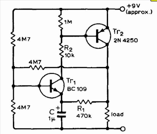 This circuit is from a 1975 technical publication. The PNP transistor can be the BC558 and the NPN a BC548. The frequency is given by C, which can have its value changed in a good range of values. The current drained for 50 mA pulses is only 1 uA, as the pulses are short-lived. The circuit is ideal for exciting LEDs.