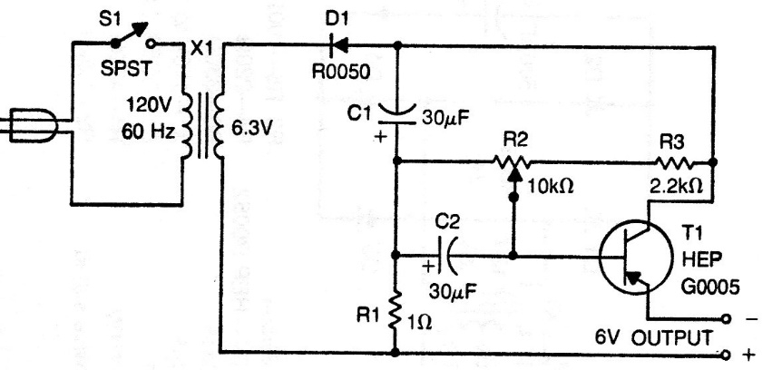 The purpose of this simple stabilized source, obtained in a documentation from the 70s, is to provide 6 V for the supply of devices that use 4 small, medium, or large cells. The transistor can be the TIP32 and the electrolytic capacitors can be 47 uF or even 100 uF which are standard current values. Diode D1 is 1N4002. A 100 uF decoupling capacitor may be required in parallel with the output. The maximum output current is 500 mA, depending on the transformer used.