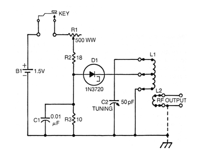 This circuit is from a publication from the 70s. The tunnel diode is the critical component, and the adjustment pot may be 470 ohms wire. The L1 coil determines the frequency of the circuit. For the 7 to 15 MHz band, use 7 + 7 turns of wire 28 in a 1.5 cm diameter cardboard tube. L2 consists of 6 turns of the same wire over L1. The variable capacitor can be removed from an unused AM radio. The circuit power is very low, and its power comes from a 1.5 V battery.