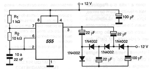 In the figure we have a converter that generates a negative voltage from a positive voltage source. The current available at the output of this power supply is of the order of a few microamperes, but it can be used in polarization circuits, which can be important in certain applications that involve operational amplifiers with a symmetrical source operating in a very low power regime. The circuit operates as an oscillator whose frequency depends on the capacitor connected to pins 6/2 and has an inverted voltage triplicator at the output in order to generate negative voltages. We observe that the value of -12 V generated is "open", that is, without load and that the circuit has no regulation. A regulation can be implemented by feeding the circuit with the output voltage itself. The circuit also works with other input voltages, in the range of 5 to 15 V, without problems.