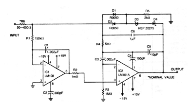 The operational amplifiers used on this Motorola circuit from the 1970s are no longer common, but the configuration can be made with more modern components, such as the 741 amplifiers. With this, the power can also be provided by a symmetrical source of lower voltage. D3 and D4 are 7.5 V zener diodes and the other diodes can be general-purpose types such as 1N4148. For lower supply voltages, zeners must be changed.