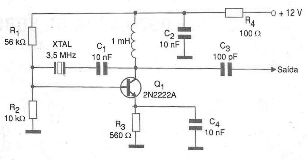 The original frequency of the Pierce Oscillator with bipolar transistor is given by the crystal, which can be changed in the range between 1 MHz and 10 MHz typically. The circuit shown in the figure can be supplied with stabilized voltages in the 9 to 12 V range. Capacitors must be ceramic, and the transistor supports equivalents. Note that the circuit supports other crystal frequencies and transistors equivalent to 2N2222, many of which are available in the libraries of the simulation programs.
