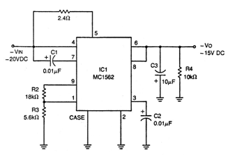 The integrated circuit used in this regulator is not easy to obtain, since the publication is from the 70s. The circuit provides an output of -15 V under current up to 300 mA with input of -20 V. The integrated circuit used has a metallic enclosure that facilitates heat dissipation.