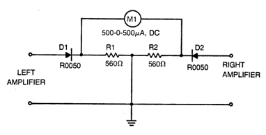 This simple circuit indicates when the two channels of stereo equipment are balanced. The diodes can be 1N4002 or 1N4004 and the indicator is a microammeter with zero in the center of the scale. The circuit is connected to the amplifier outputs. It is convenient to connect in series with the indicator instrument a resistor from 1k to 4k7, depending on the power of the amplifier.
