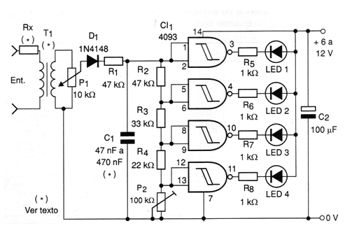 The circuit shown in the figure, activates a bar of 4 LEDs with an audio signal applied to its input. The resistors in series with the LEDs determine their brightness and can be reduced if the supply voltage is less than 9 V. The capacitor C1 determines the inertia of the system, that is, the speed with which it responds to variations in the audio signal of input. The transformer serves to isolate the audio circuit from the bargraph. Any small power transformer that has a primary winding for the power grid (which will be connected to the potentiometer) and a secondary 3 to 9 V with current in the range of 50 mA to 250 mA can be used. The potentiometer is used to adjust the operating point of the moving bar indicator according to the intensity of the input signal. The 100 k ohm trimpot is used to adjust the scale, so that all LEDs are off in the absence of a signal. In fact, this trimpot adjusts the scale range. The circuit can be adapted to operate with 2 4093 and thus trigger up to 8 LEDs on a scale. In this case, the input resistor network must be adapted. For a greater number of LEDs, however, the supply voltage must be between 9 and 12 V. The primary of the transformer is connected to the speaker output of the stereo. Rx depends on the power of the sound equipment, according to the following table: