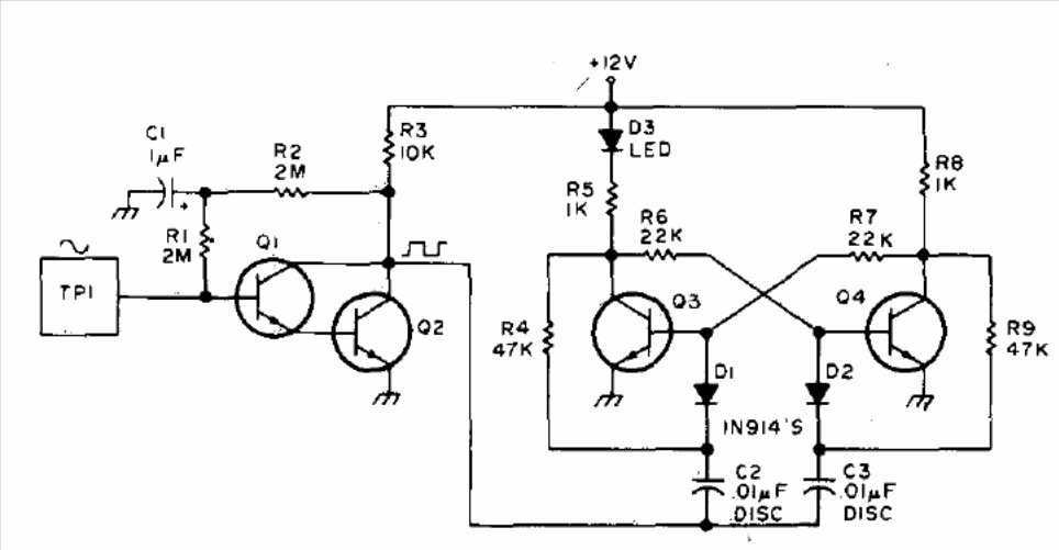 We found this circuit in a 1976 documentation, but it can still be easily assembled using BC548 transistors. A second LED in series with R8 can be used. A touch of the sensor causes the LED to light up or go out. Do not use a source without a transformer to power this circuit.