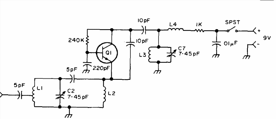With this circuit, obtained from an American publication for radio amateurs in 1976, it is possible to receive signals in the VHF range from 150 to 220 MHz in a common AM receiver. The tuned L3 / C7 circuit must be set to an AM free frequency and placed next to the receiver. L2 and L4 are shocks of 100 uH and L1 should have 2 + 2 turns of wire 28 in the form of 0.5 cm without core. The circuit has low consumption and can be powered by battery.