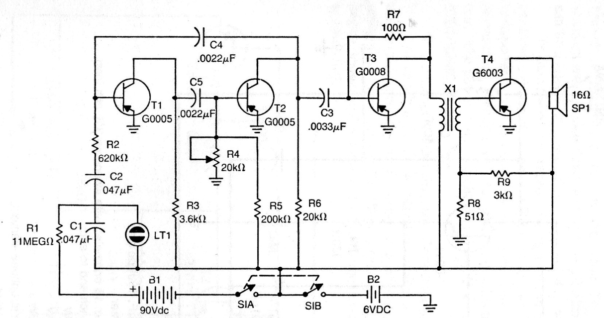 This circuit produces a strong tone of audio or ultrasound, depending on the values of components C1 and R1, serving to scare animals. The circuit uses a 90 V battery that no longer exists in our times and should be replaced by a source. The circuit consists of a relaxation oscillator with a neon lamp whose tone is amplified by common transistors. T1, T2 and T3 can be BC557 and T4 a TIP32. The transformer can be obtained from old transistor radios. The component values can be changed to the most modern standards, as the circuit is from an American publication from the 70s.