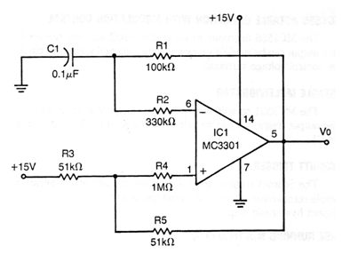 This oscillator employs a Motorola operational amplifier common in the 70s. We can implement the same configuration with a common operational amplifier in our times as the 741. The frequency is given by C1 and for this circuit it will be around 1 kHz. The maximum frequency depends only on the operational amplifier used. The circuit does not need a symmetrical source and the output signal is rectangular. R3 and R5 can be 47k.