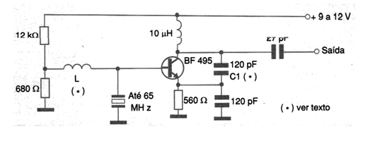 With the circuit shown in the figure it is possible to generate signals up to 65 MHz. The values of L and C1 depend on the frequency range of the signal to be generated, according to the following table: