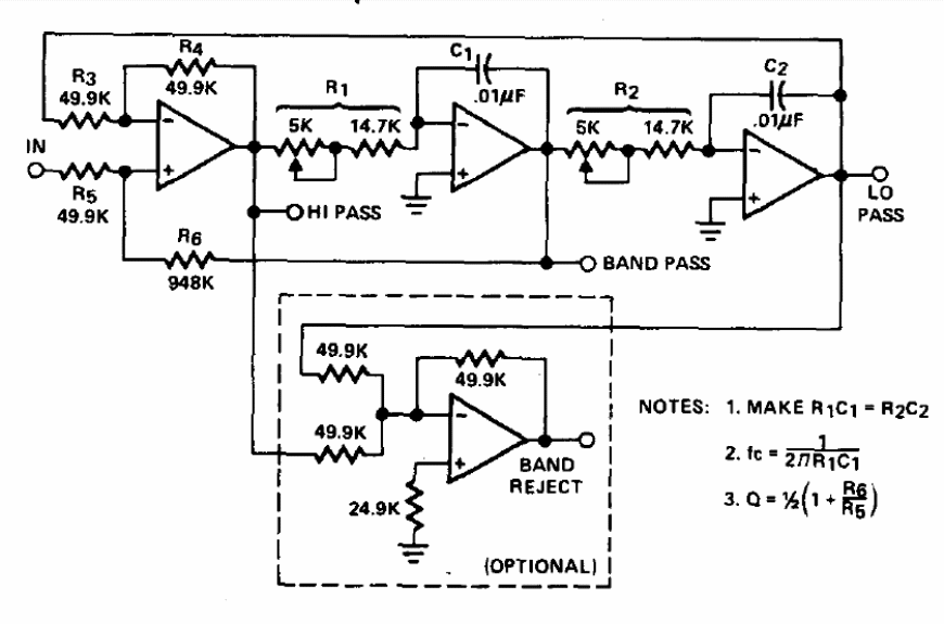 This filter has a factor Q = 10 (selectivity), and its frequency can be changed as shown in the formulas along the diagram. The application is from a 1977 publication. The source must be symmetrical, and the fourth block of the circuit is optional.