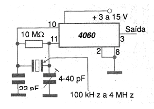 The CMOS 4060 integrated circuit consists of a frequency divider counter with internal elements already incorporated for the elaboration of an external oscillator, both RC type and crystal controlled. In the figure we show how to implement a crystal oscillator with frequencies up to about 4 MHz using this component. We observe that the maximum frequency depends on the supply voltage, so the 4 MHz will only be reached with a supply higher than 9 V. The trimmer adjusts the ideal oscillation point so that the circuit is initialized when the power is turned on. This is achieved by compensating for the internal capacitances of the crystal. Remember that the signal obtained at the output of this circuit is rectangular.
