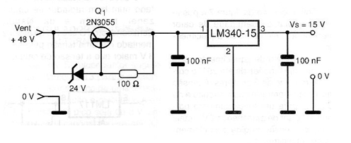 To operate with high input voltages using a 3-terminal voltage regulator like the LM340-15, we can use the circuit shown in the figure. This circuit also serves for integrated circuits that admit no more than about 25 V of input. Both the voltage regulator integrated circuit and the 2N3055 power transistor must be mounted on good heat radiators. The zener diode is 1 W. Note that in this circuit the output voltage is 15 V, but other integrated ones with different outputs can be used according to the desired application. The maximum output current of this circuit is 1.5 amps.