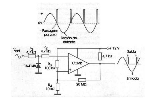 This is a circuit widely used in power controls. When the alternating supply voltage goes through zero, a clock is generated for a thyristor, as shown in the figure. In the same figure we show how to implement this circuit using an LM339 type comparator. The presented circuit uses a simple power supply. With sinusoidal signals, the circuit will generate a positive pulse of short duration in its passage through zero.