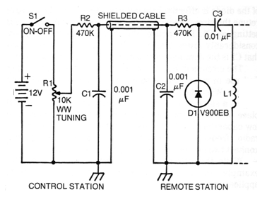 This configuration from a 1976 technical documentation shows how to use a varicap in a direct current tuning system using a shielded cable. The circuit can be implemented with varicaps from the BB series. Two 9 V batteries in series can be used in the supply to obtain a greater control range according to the varicap. The coil is that of the tuned circuit that must be controlled. A 100 k paraR1 potentiometer greatly increases the durability of the power supply.