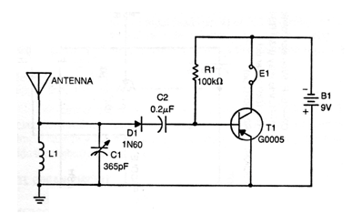 This traditional direct amplification MW radio configuration was obtained in an American publication from the 1970s. The coil consists of 100 turns of wire 28 in a ferrite rod and the antenna must be long. The transistor can be the BC558 and the phone must be magnetic from 1k to 5k. For a ceramic phone, connect a 4k7 resistor in parallel. The supply can be done with voltages from 6 to 12 V. The variable capacitor can be obtained from an old MW radio that is not in use.