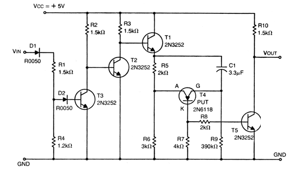This circuit is from a technical documentation from the 70s, and equivalents can be used for common transistors such as BC548. The circuit provides a delay for a signal that is given by the time constant C1, R9. The circuit can be powered by higher voltages, but in this case the 5 V is justified by its compatibility with TTL logic. The diodes can be general-purpose type like the 1N4148. For PUT equivalent types easier to obtain in our market can be used.